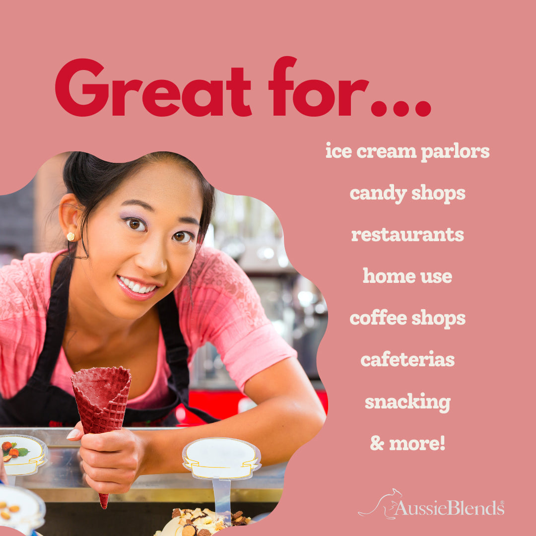 AussieBlends Waffle Ice Cream Cone Red Velvet is made with raw sugar, avoiding liquid sugars and corn syrups, which can impart a burnt aftertaste or a molasses-like flavor. Only premium natural vegan ingredients are in our cones. We make our cones with passion for your perfect ice cream.